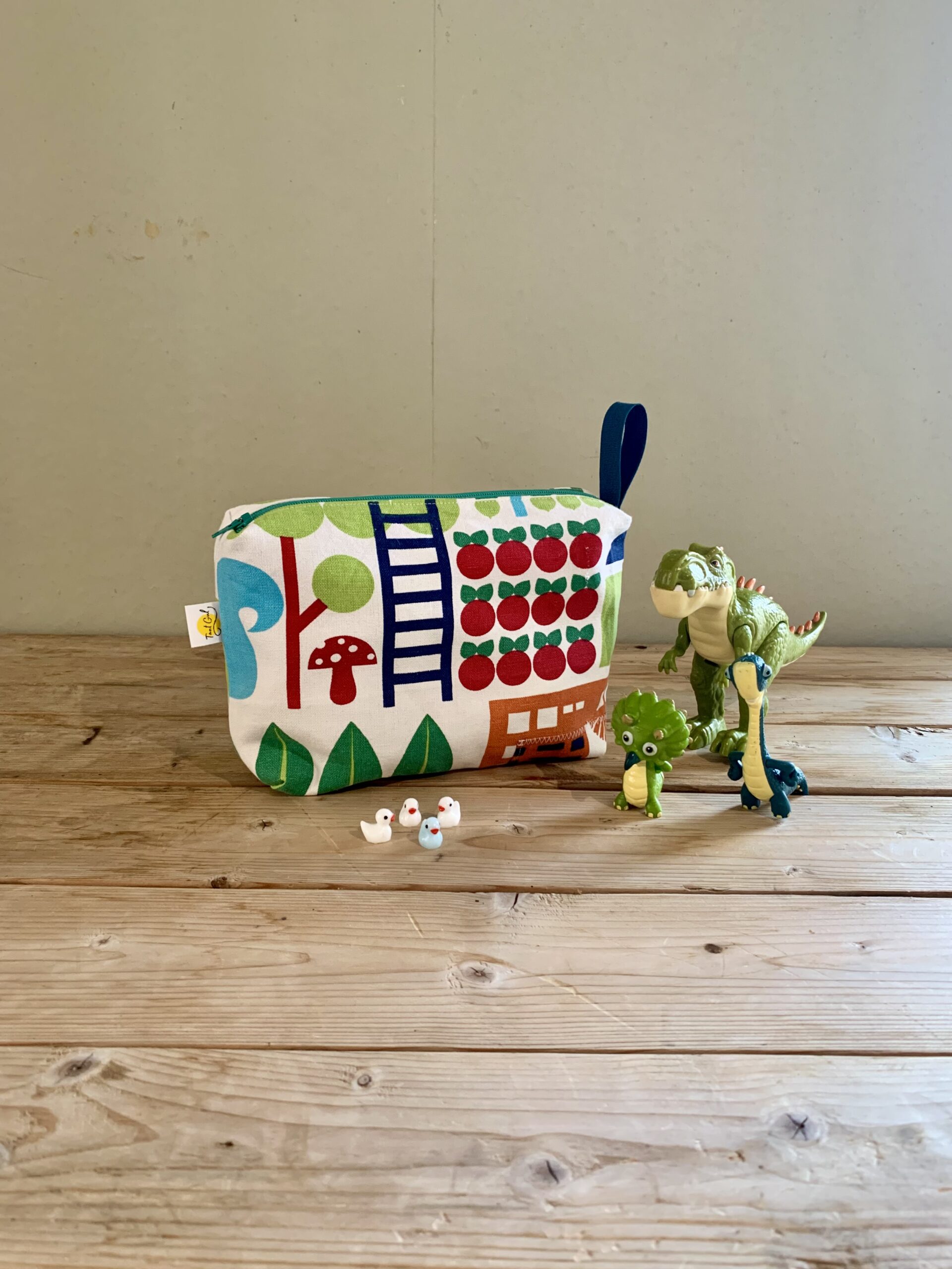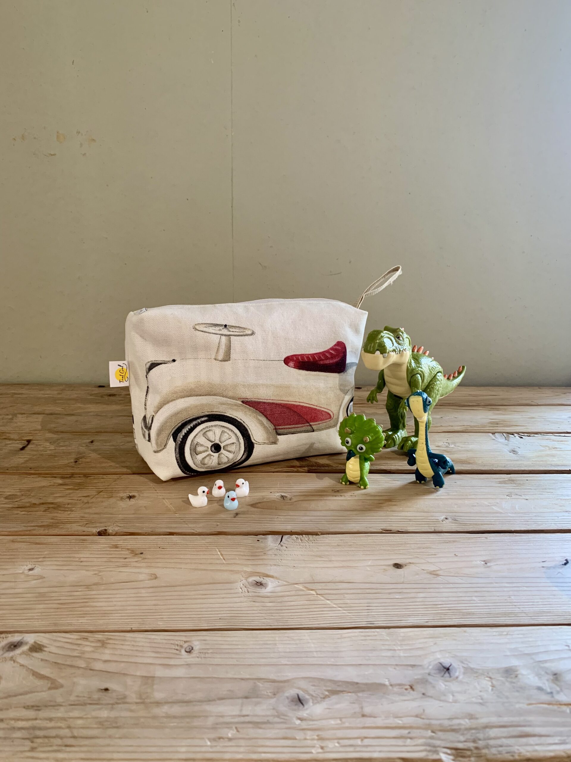 Yttertyg: leksaksbil i beige och rött på botten i off-white