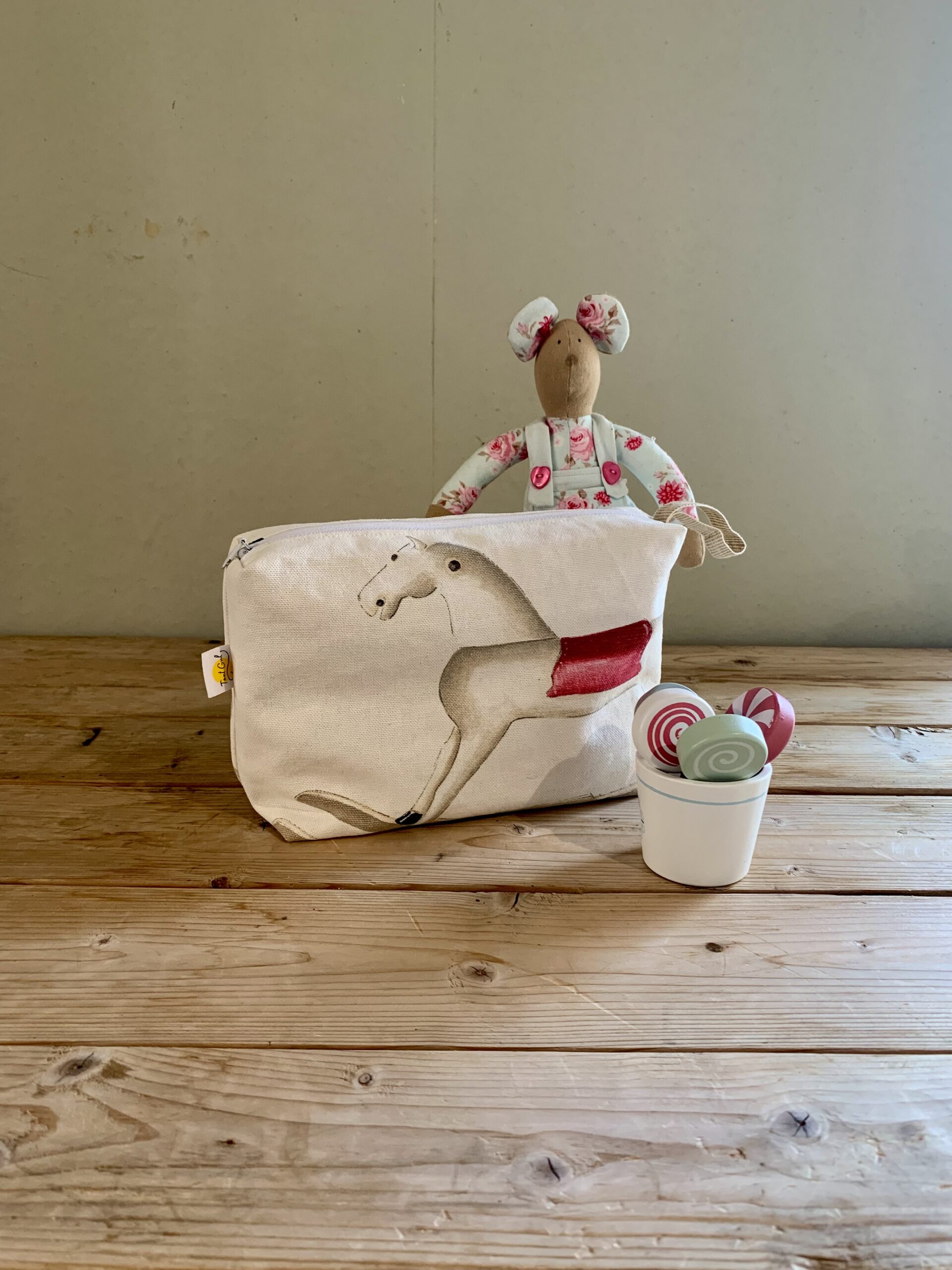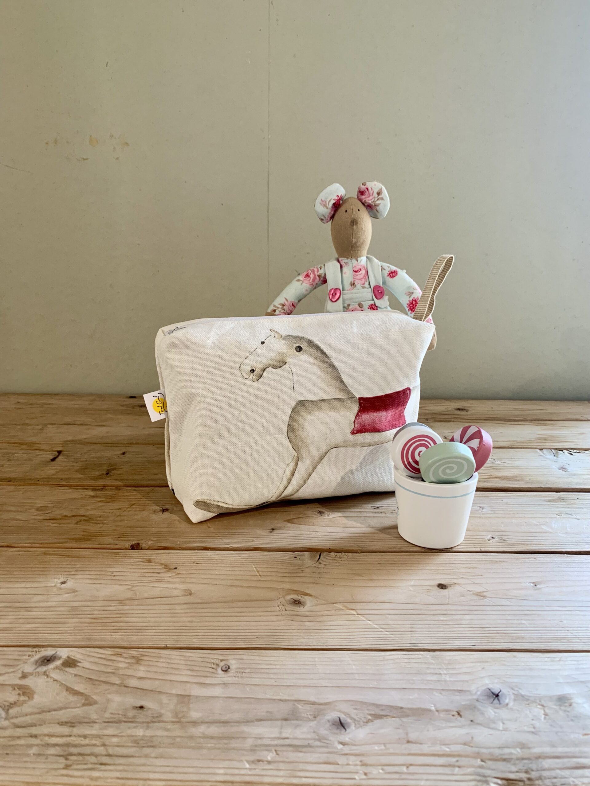 Yttertyg: gunghäst i beige och rött på botten i off-white