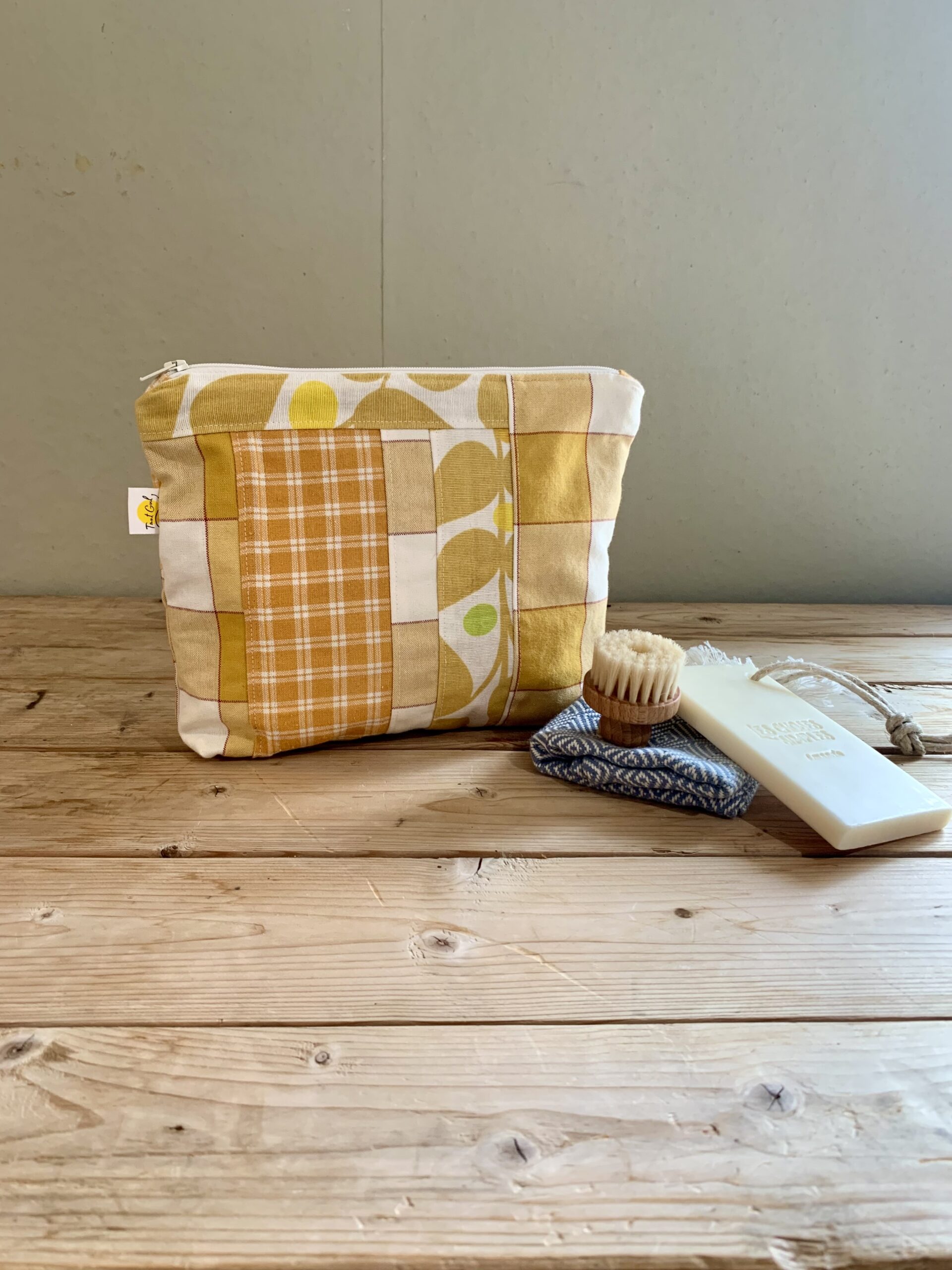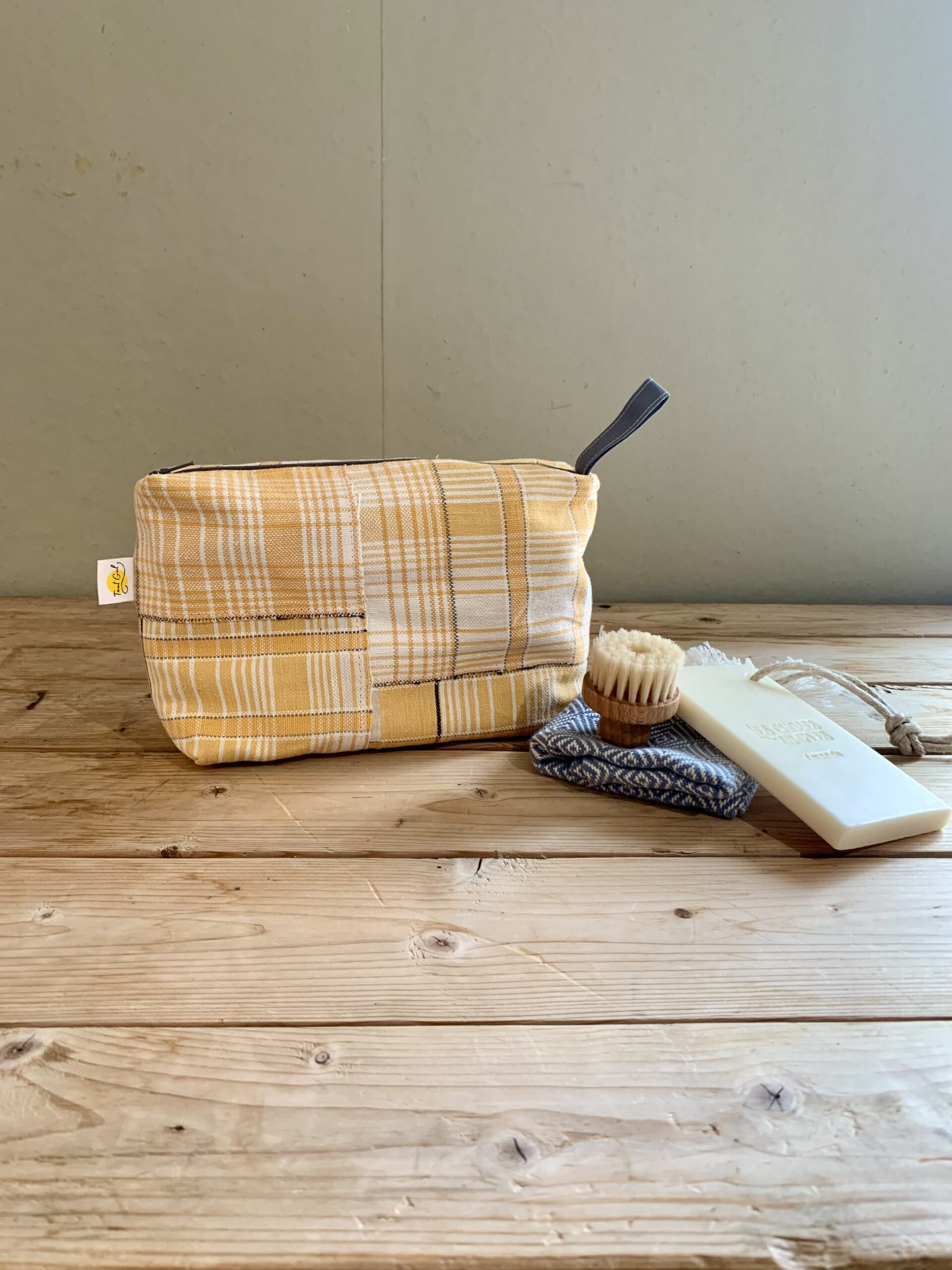 Yttertyg: rutigt i vitt och gult med inslag av svart, sydd av en fd duk, O:SPILL