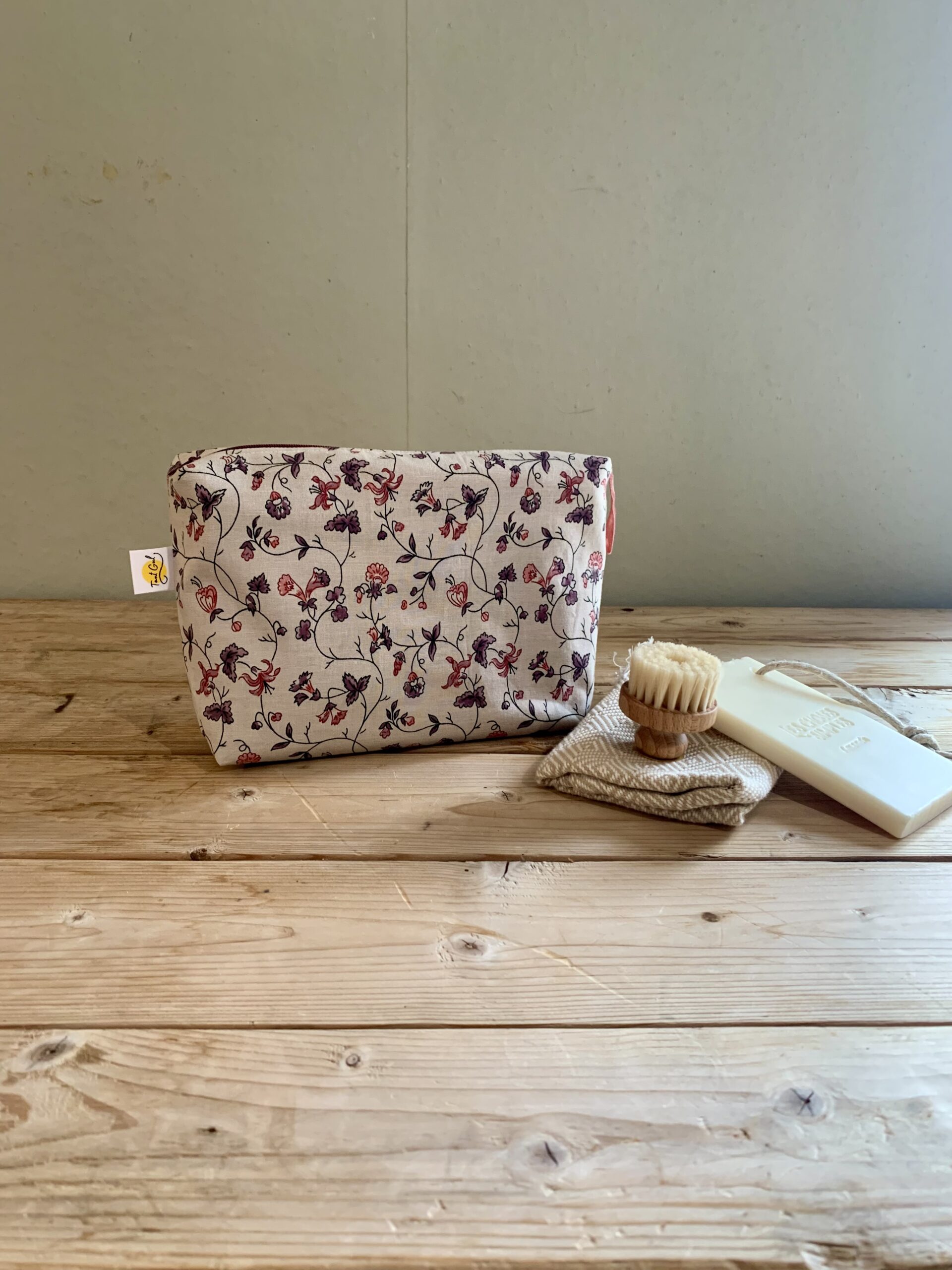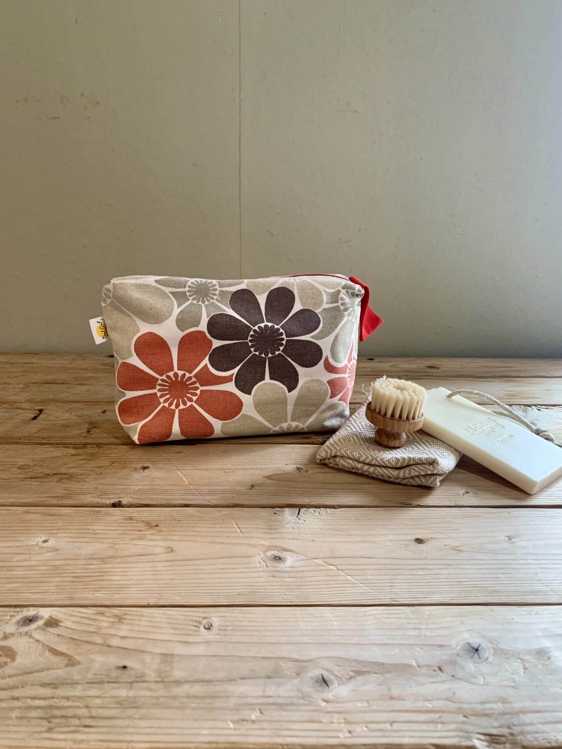 Yttertyg: beige, bruna och roströda blommor på vit botten