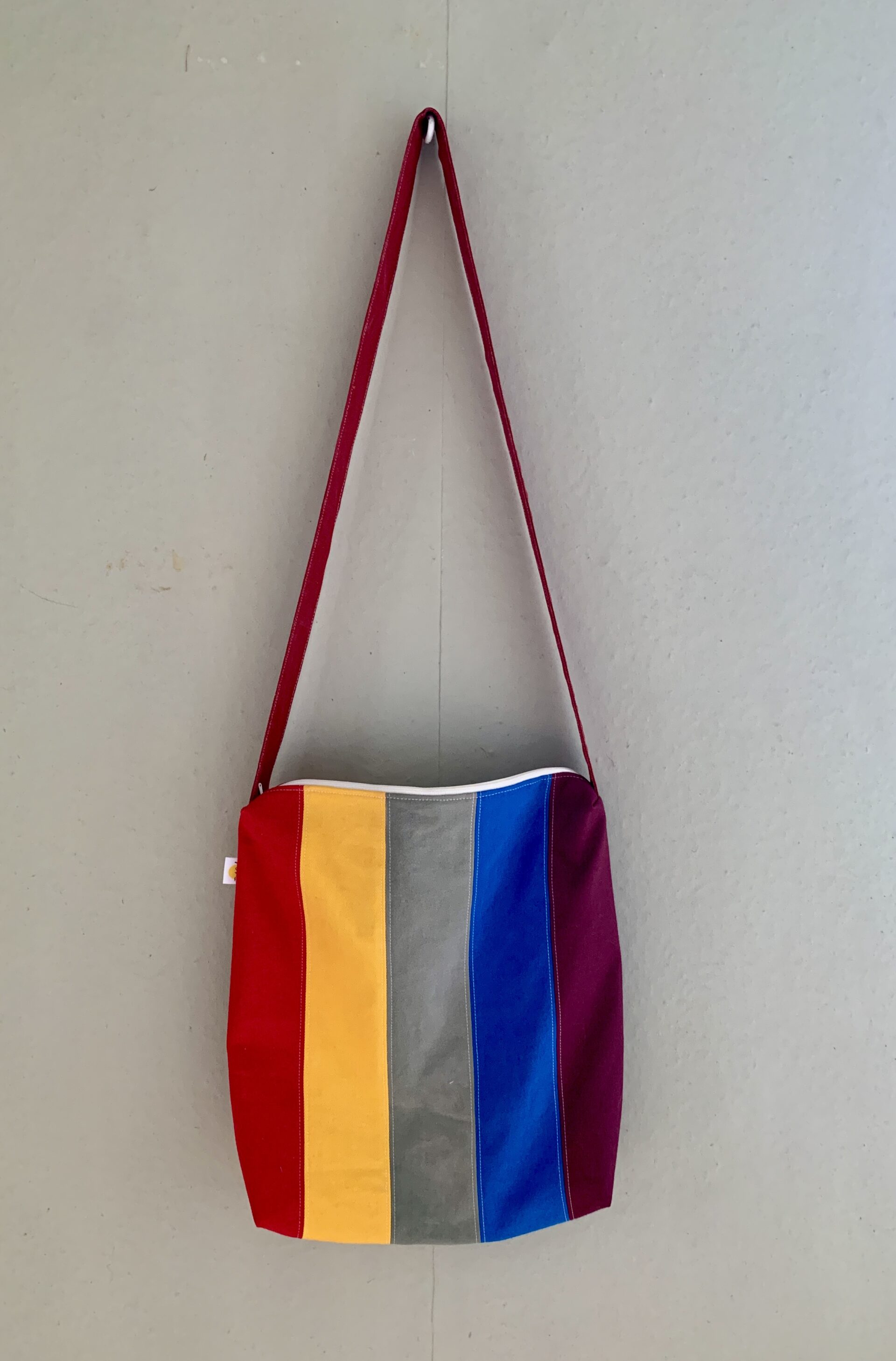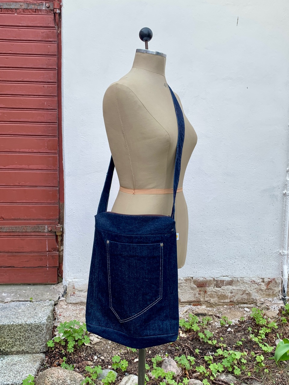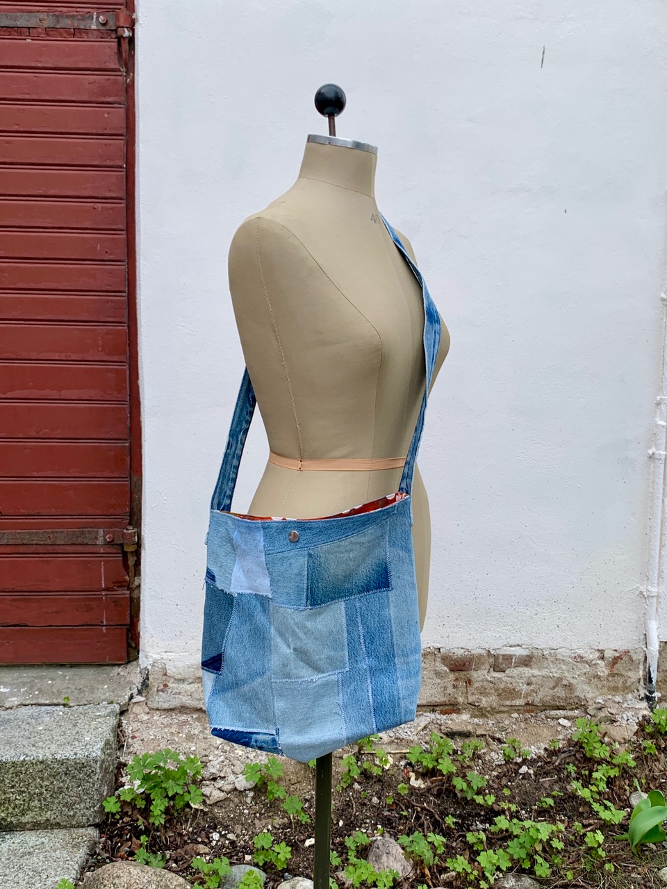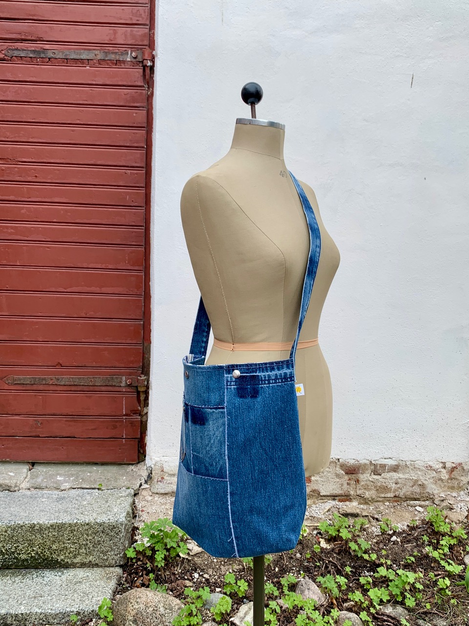 Bärrem sydd av linningen från ett par jeans: längd 109 cm