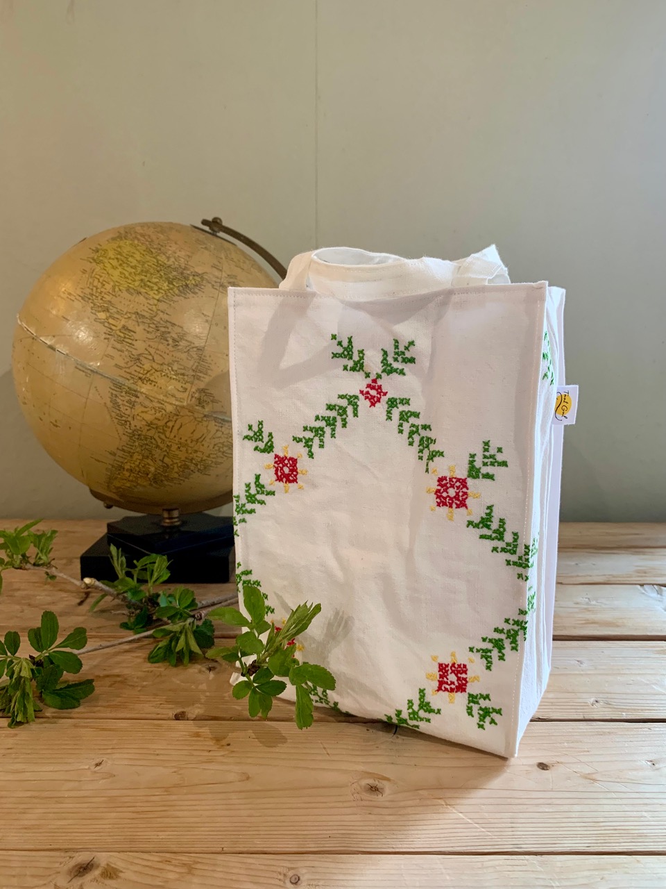 Yttertyg: fd vit duk med korsstygn i rött, grönt och gult