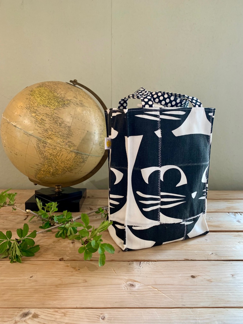 Yttertyg: mindre tygbitar med kattansikten (svarta på vit botten) ihopsydda till en kasse, O:SPILL