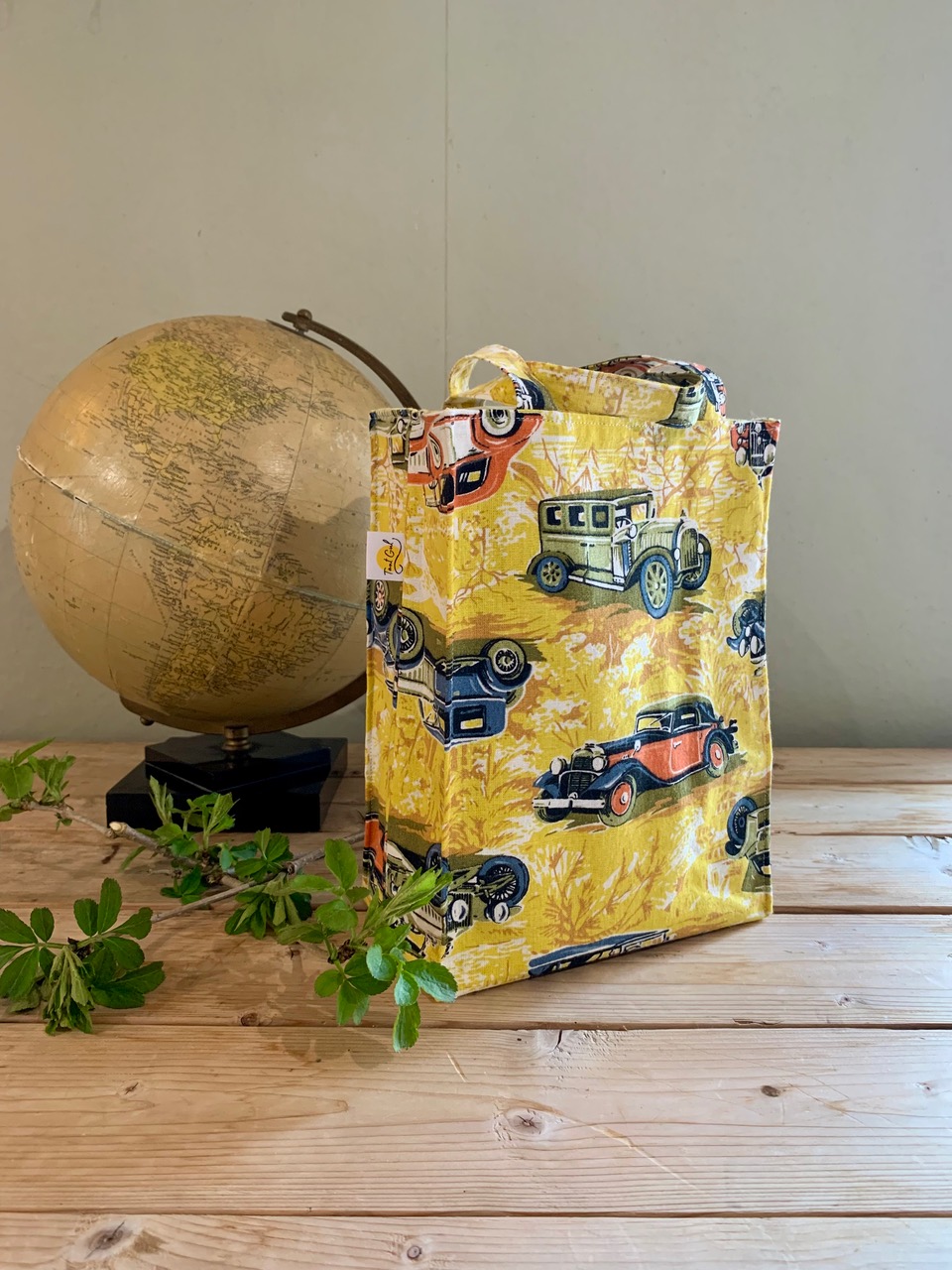 Yttertyg: veteranbilar i olika färger på gulaktig botten