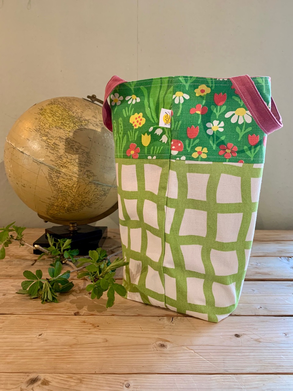 Yttertyg: blommor och svampar i olka färger på grön botten / rutigt i grönt och vitt