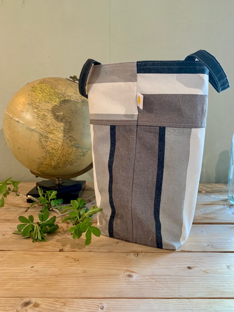 Handtag: randiga i grått och vitt