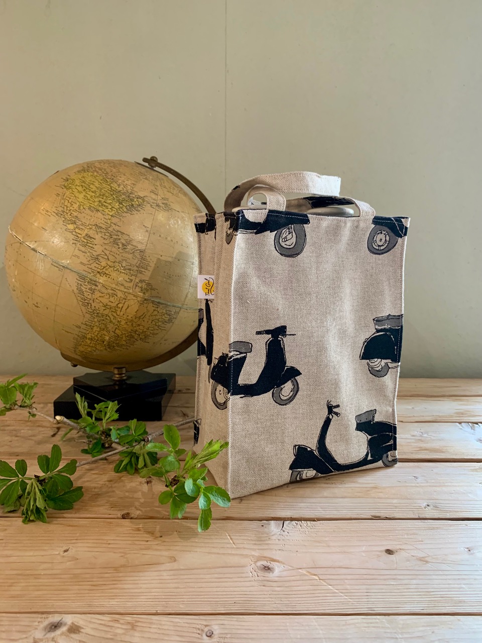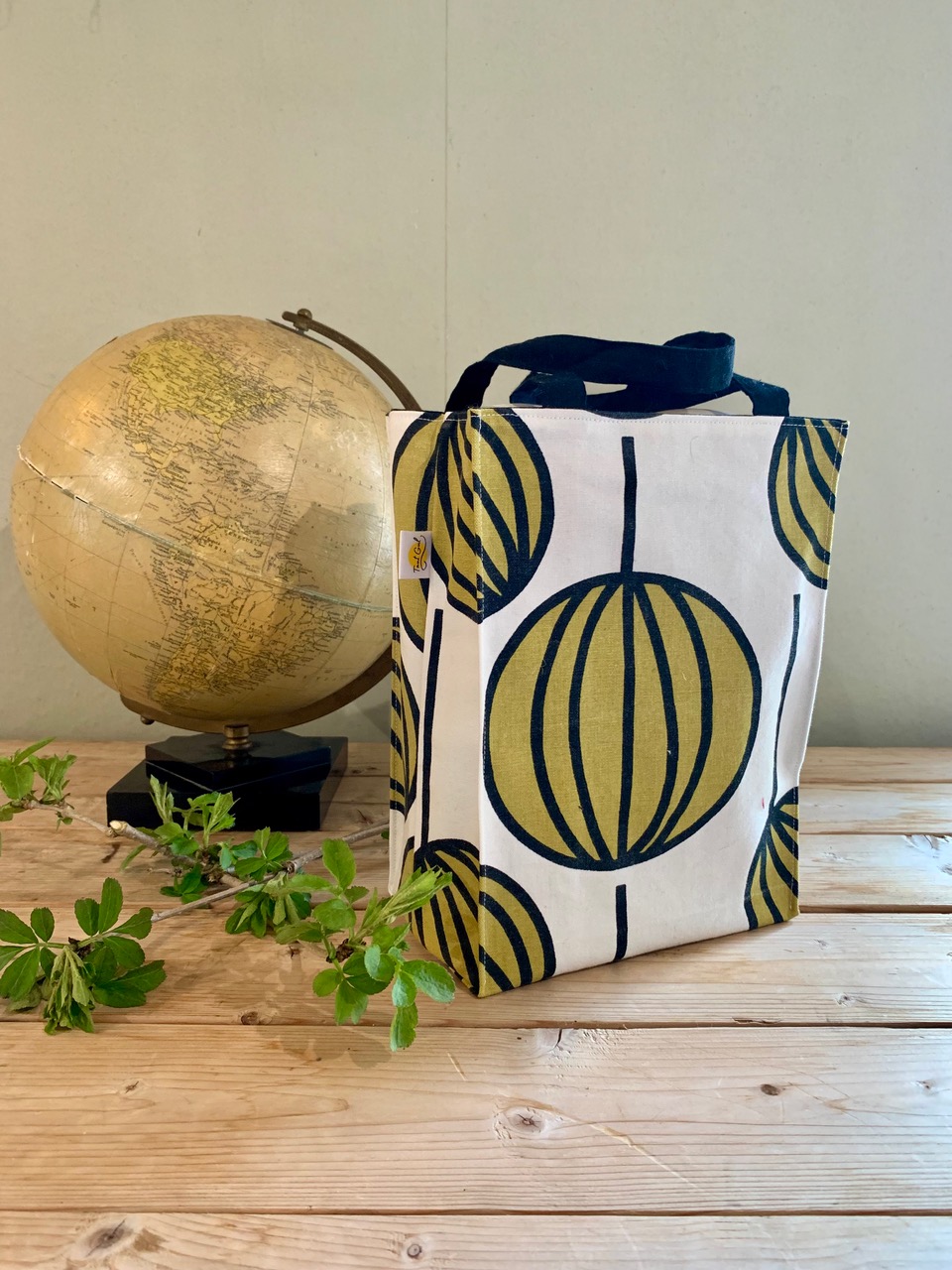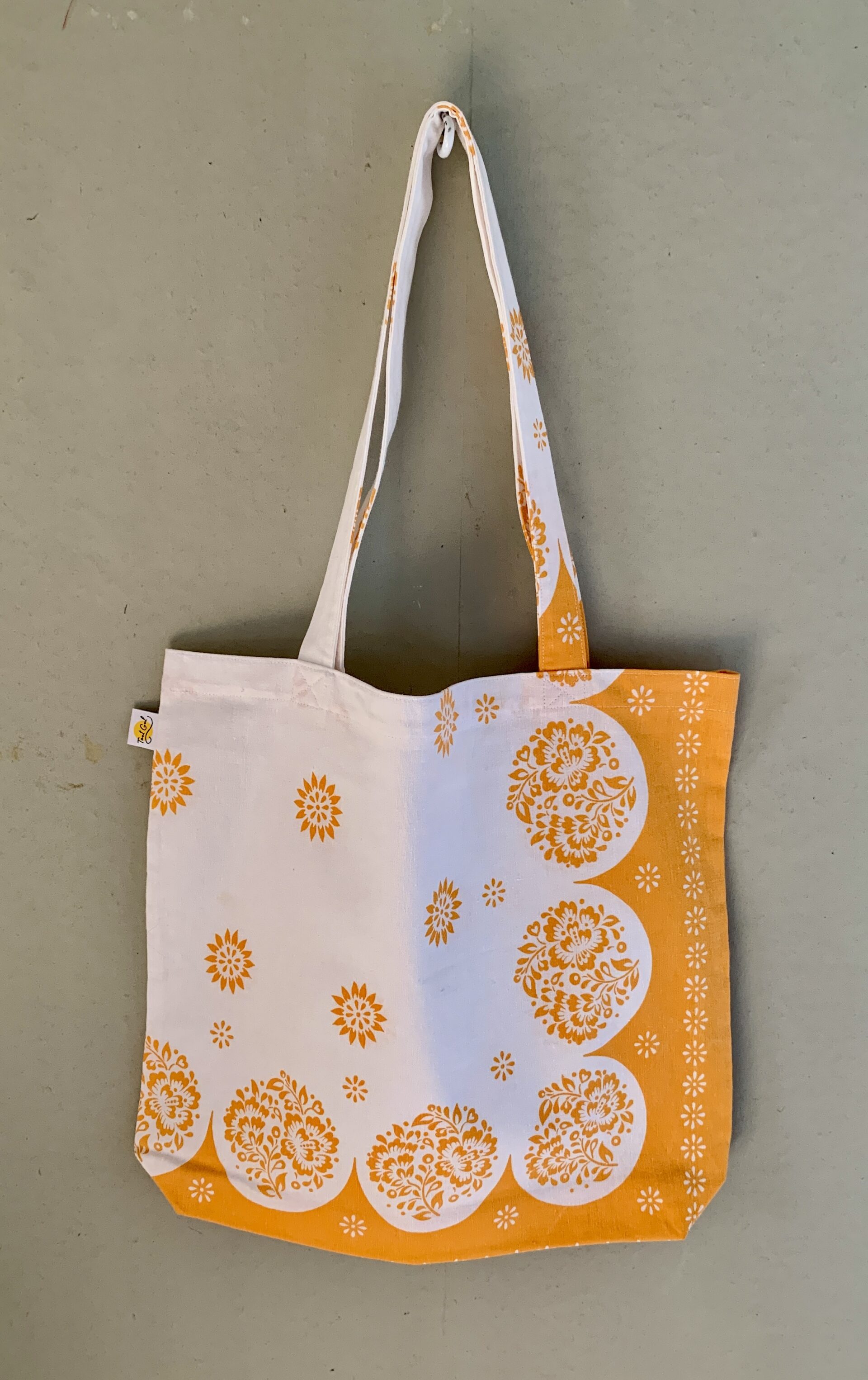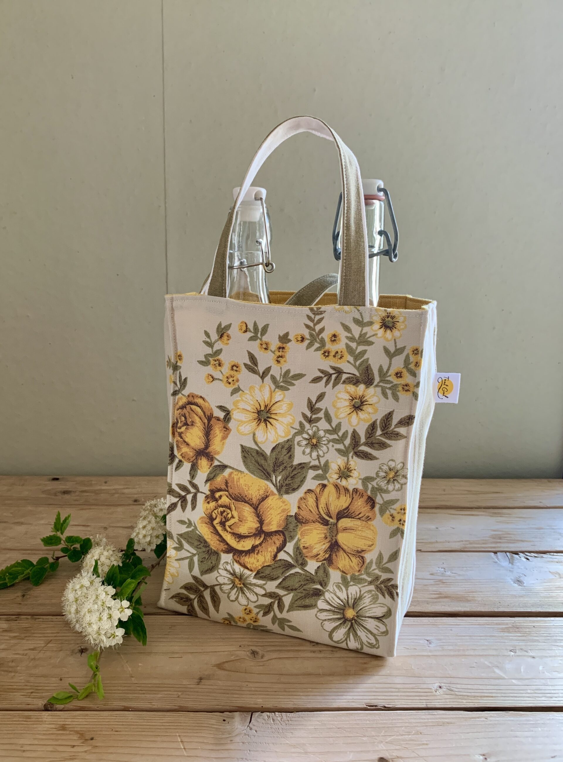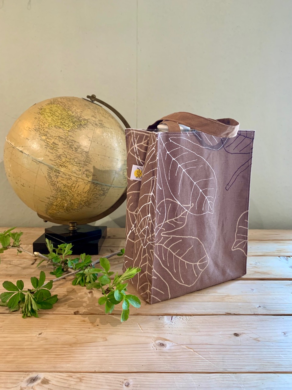 Foder: gulbeige med blekt brun text