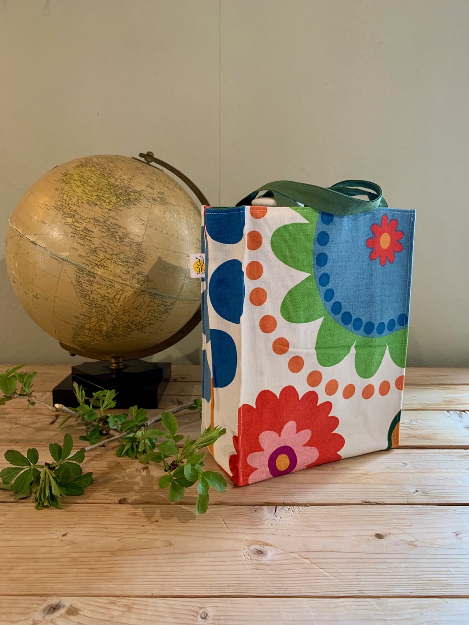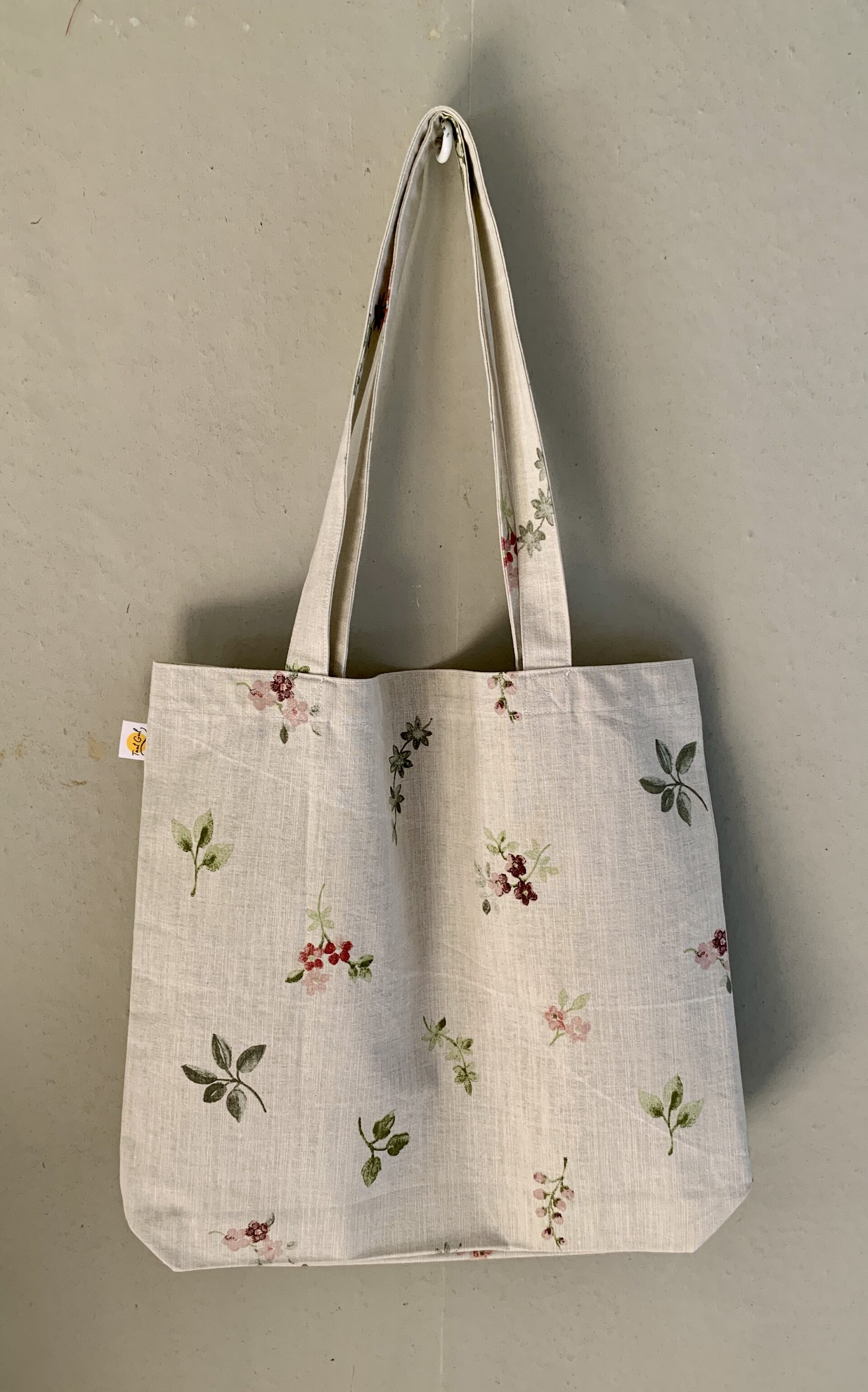 Tyg: små blommor i rosa och grönt på beige botten