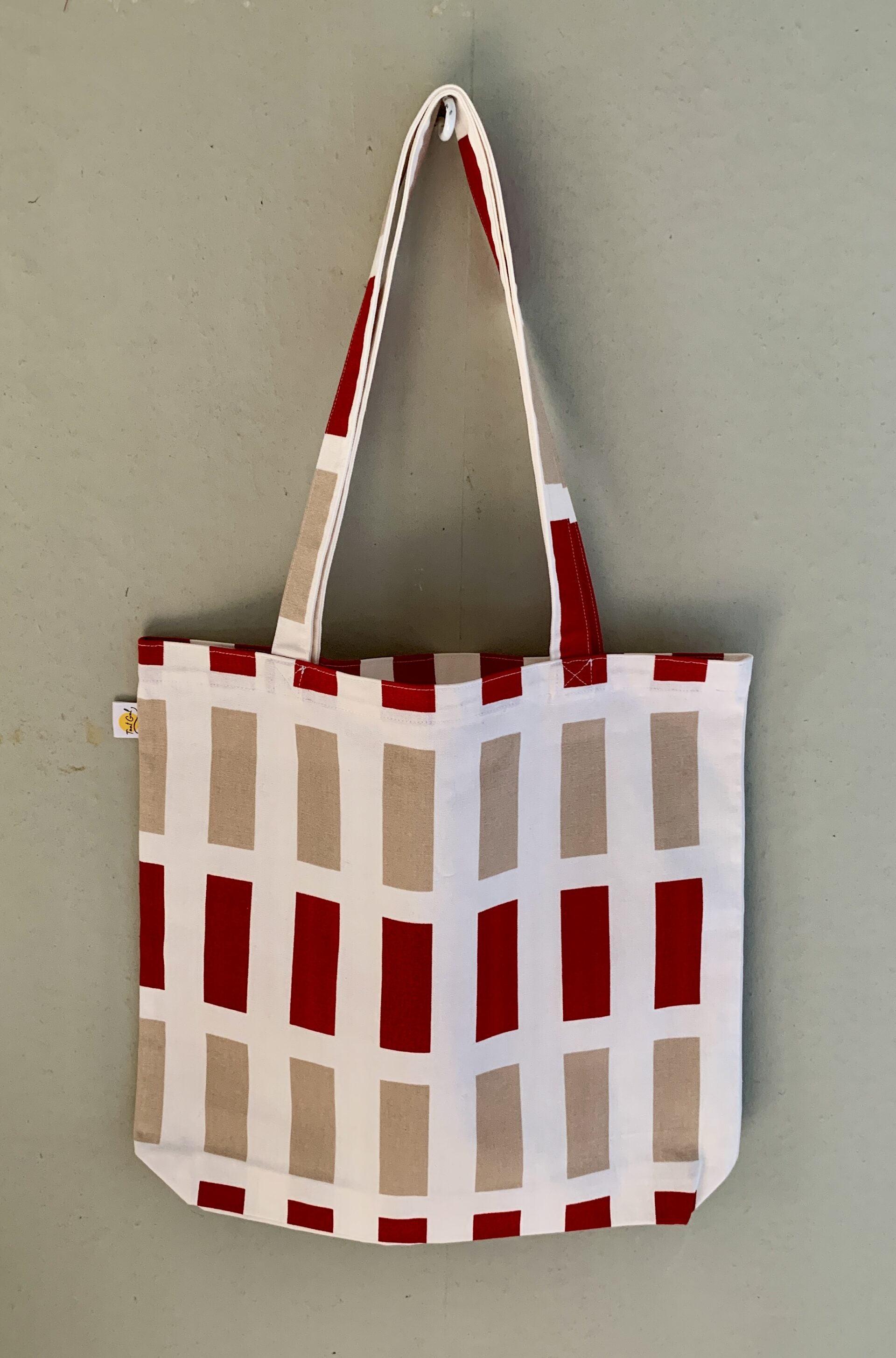 Tyg: beige och röda rektanglar på vit botten