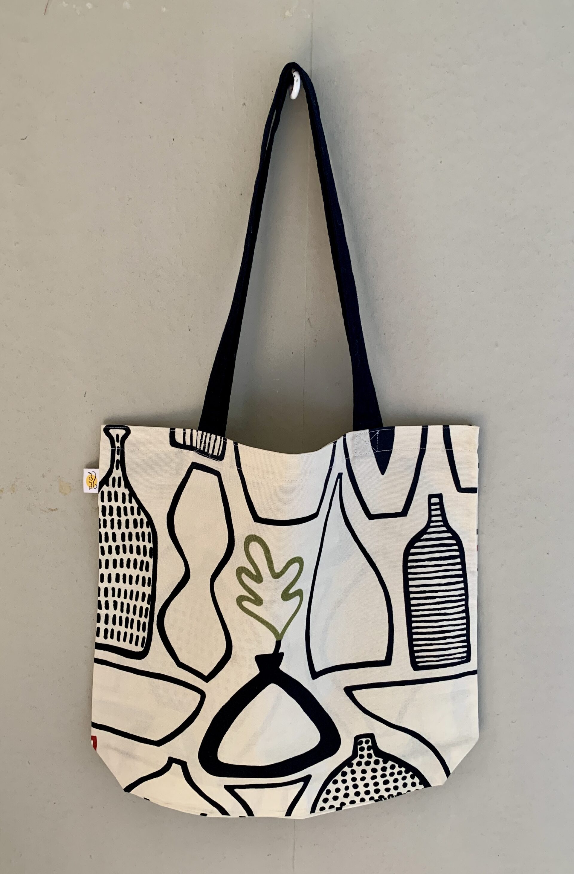 Tyg: vaser i svart på vit botten, några inslag av rött, blått och grönt
