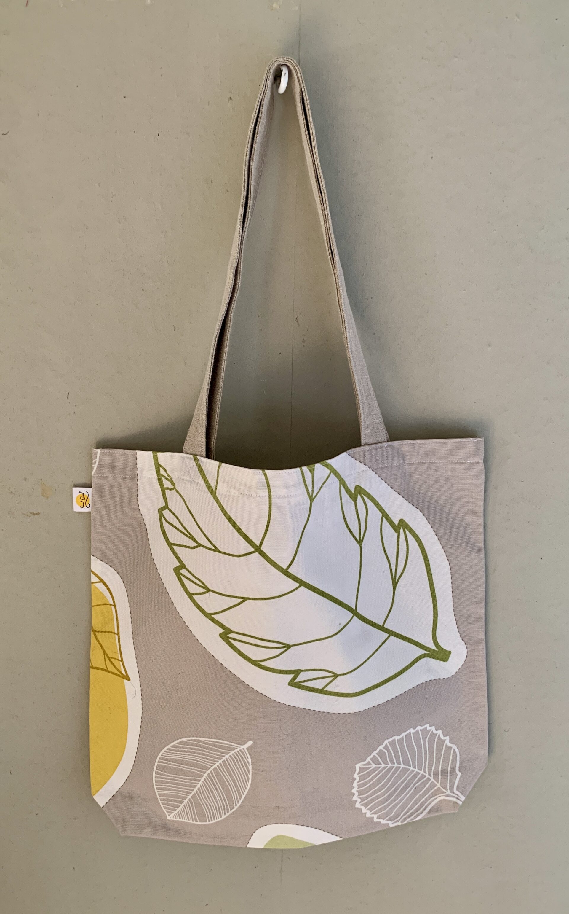 Tyg: blad i grönt, vit och gult på gråbeige botten
